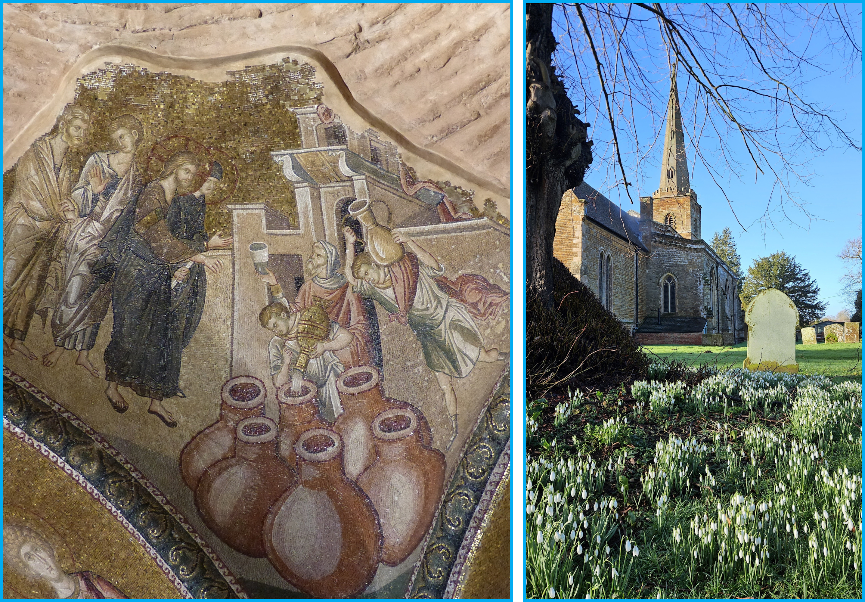 On Sunday we hear in the gospel an account of Jesus turning water into wine at the wedding in Cana. A particularly beautiful mosaic of this event is in Cora Church, Istanbul. An image is below. The building is a byzantine church, later a mosque, a museum and now a mosque again ( Kariye Mosque ).